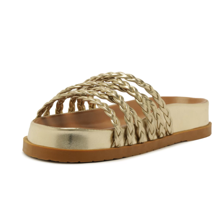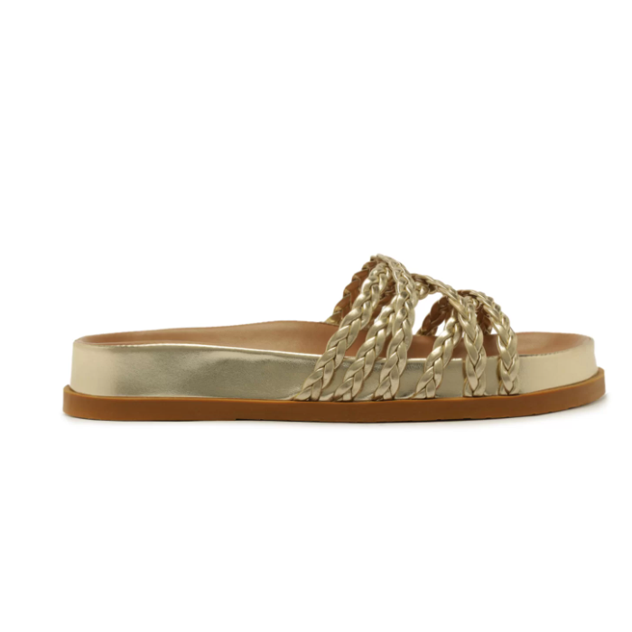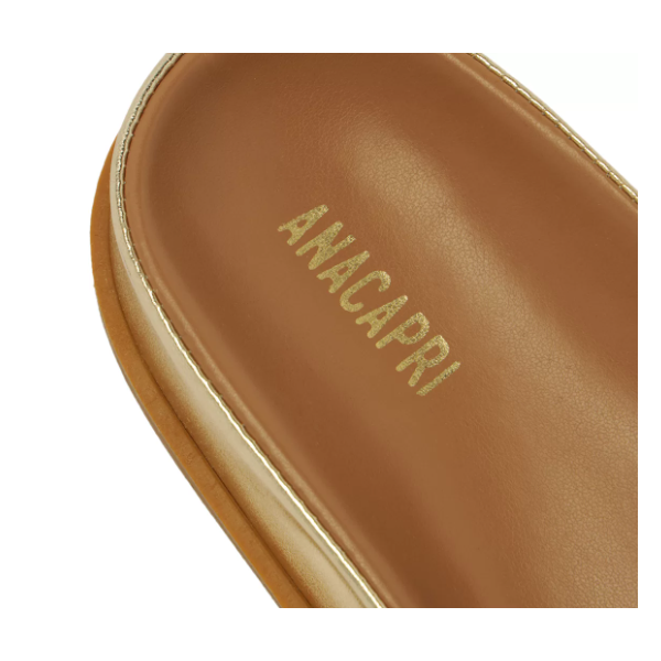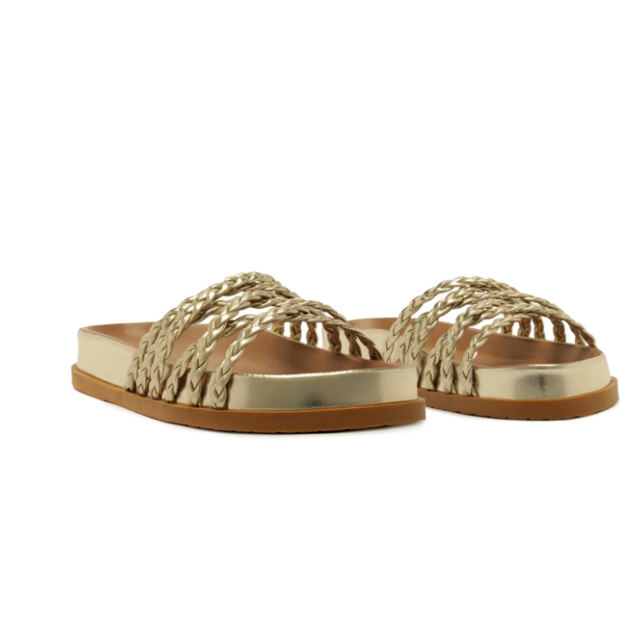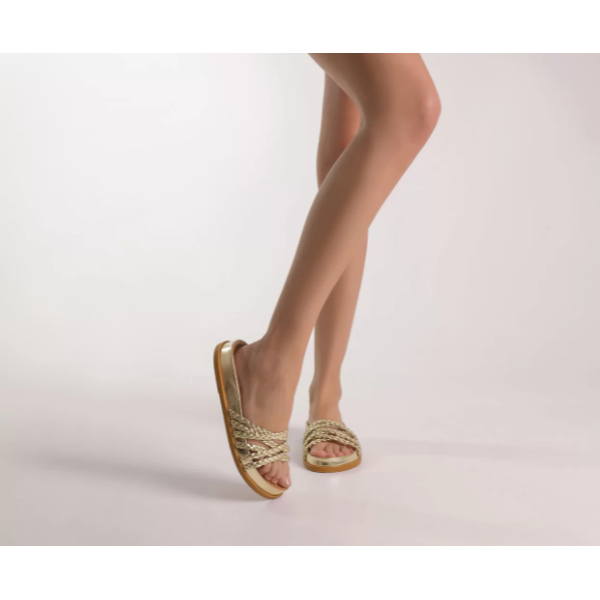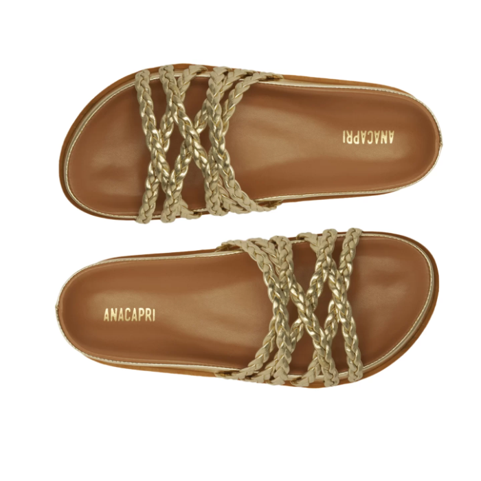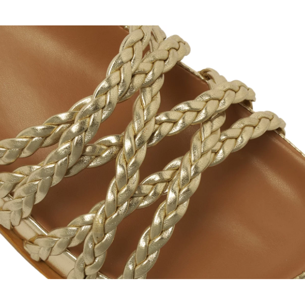 Papete rasteira Anacapri trançada dourada. O modelo robusto e imponente apresenta cabedal com tirinhas finas trançadas que se cruzam sobre os dedos e peito de pé. De bico redondo, o modelo é aberto e exibe todo o pé. Apresenta solado emborrachado e palmilha anatômica da mesma cor da papete, com assinatura Anacapri.